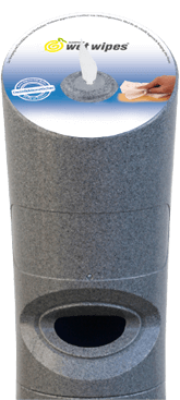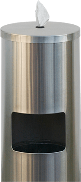 Standspender zur Einzelentnahme der Desinfektionstücher. Innovative Spendereinheit mit integriertem Mülleimer. In vielen verschiedenen Farben und auf Wunsch mit individuellem Logo erhältlich.